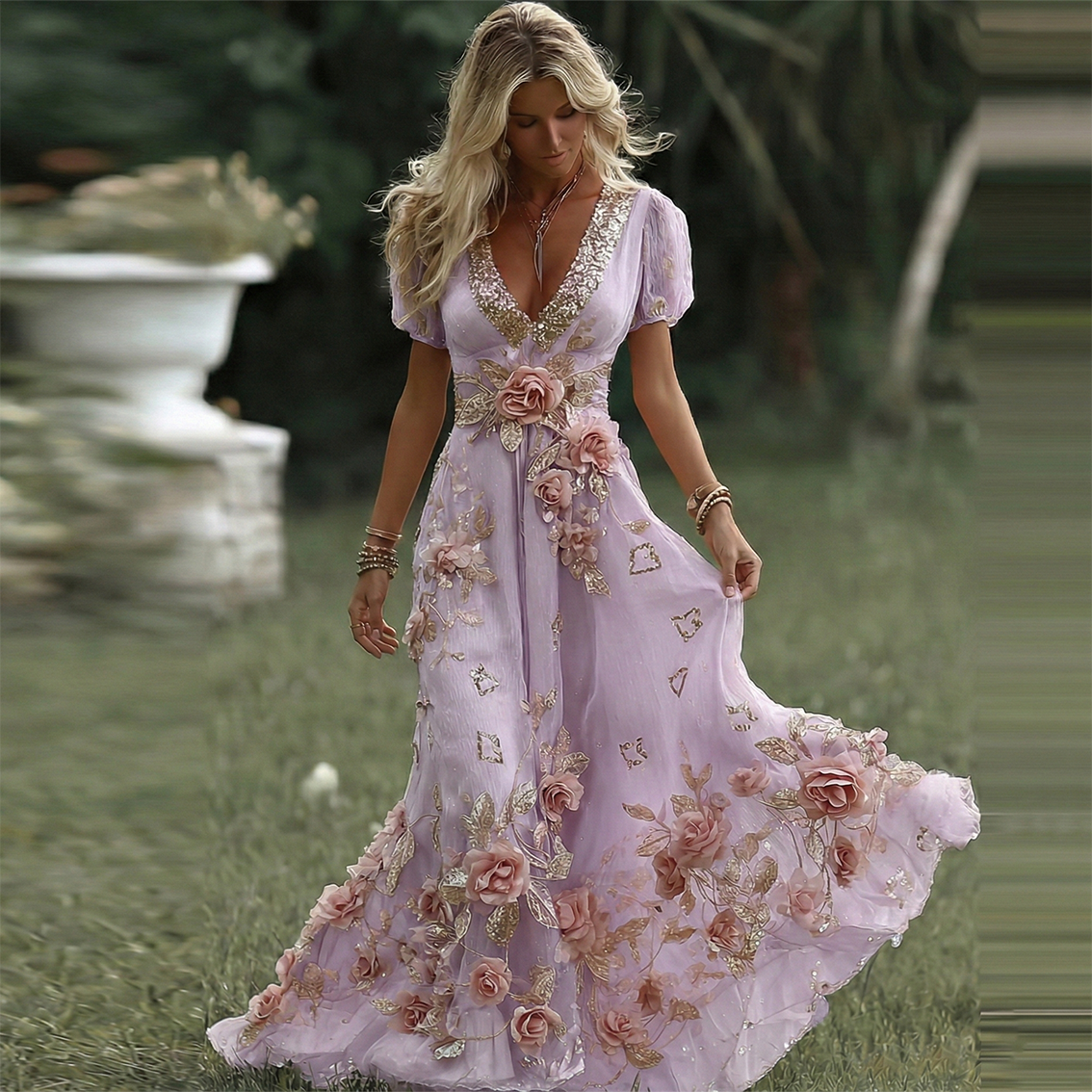 Women's Vintage Pink Rose Embroidered Art Pattern V-neck Short Sleeve Midi Dress