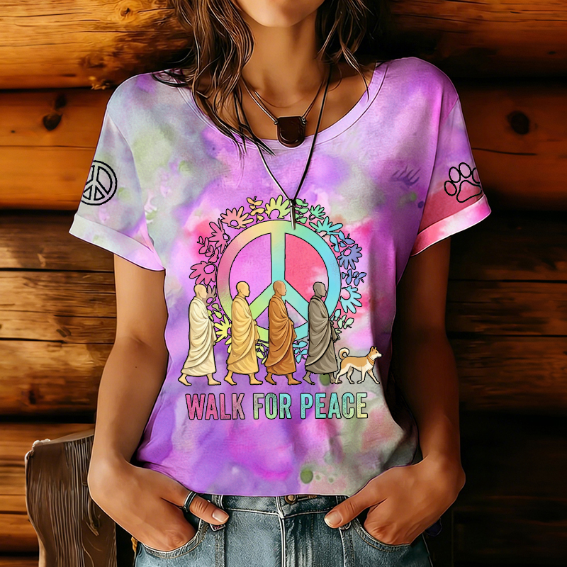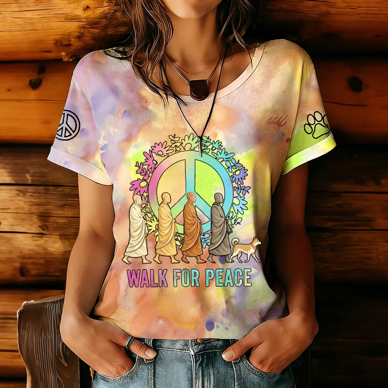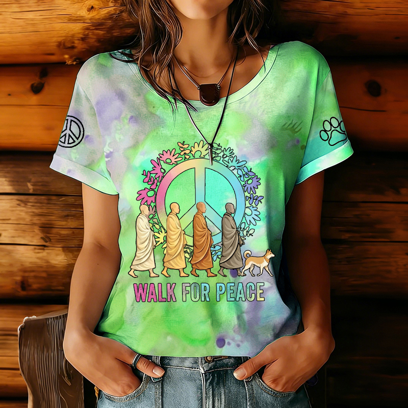Women's Walk For Peace Monks With Aloka Dog Print Short Sleeve T-shirt
