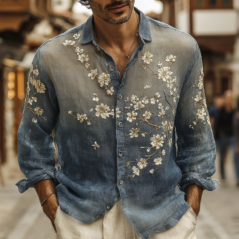 Men's Retro Flower Art Print Long Sleeve Shirt