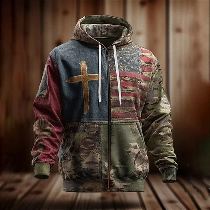 Men's Vintage Casual Faith American Flag Zip Hoodie