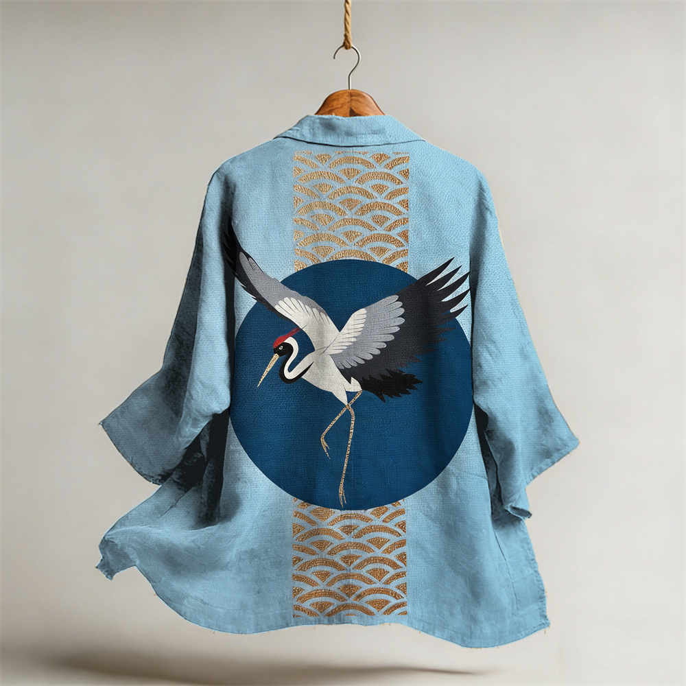 Japanese Cranes Art Pattern Flowy Linen Kimono