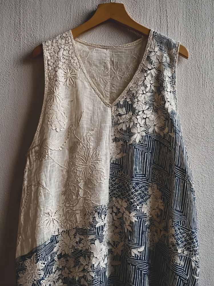Japanese Floral Patchwork Lace Linen Tank Top