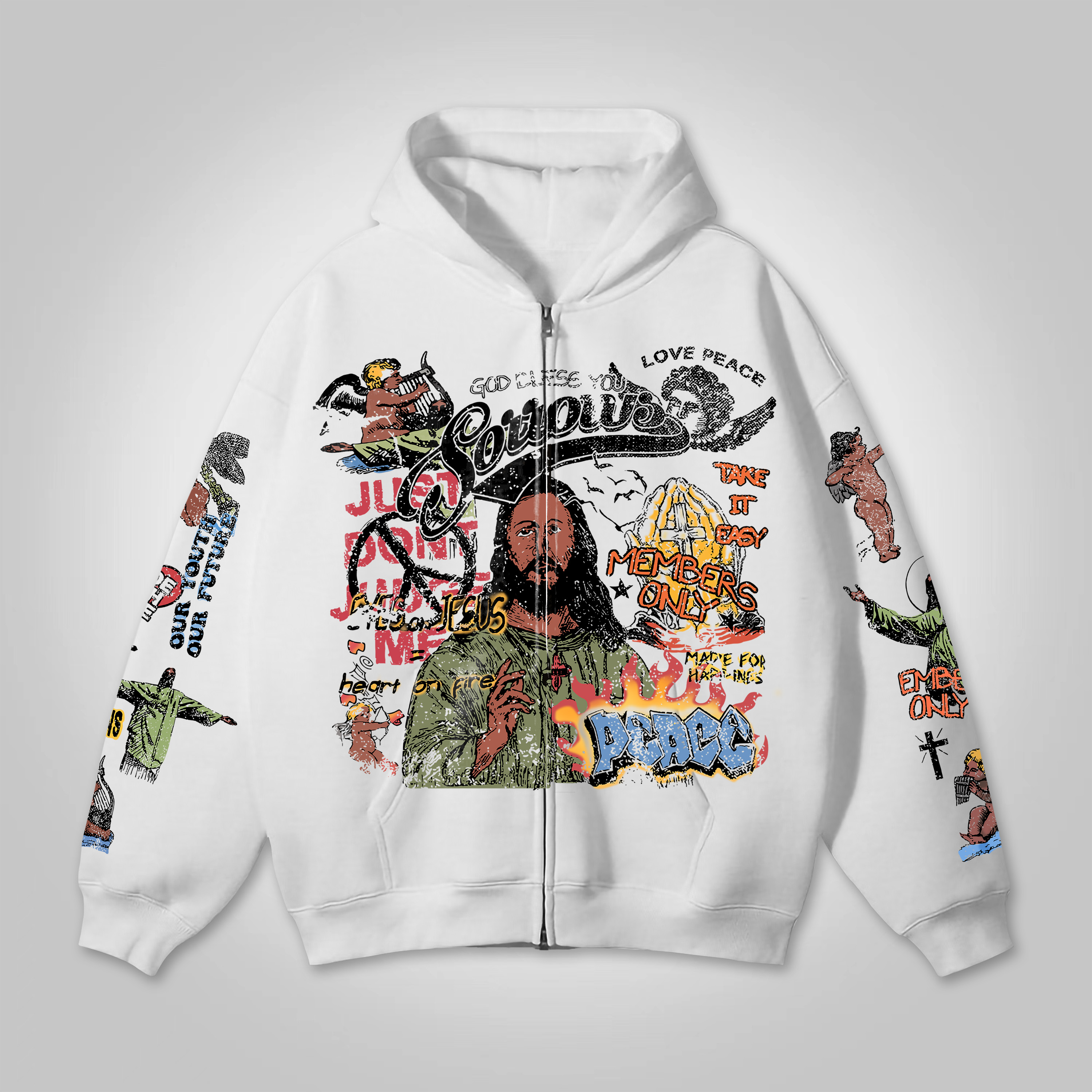 Jesus Multi-element Print Graphic Loose Velvet Pocket Zip Hoodie