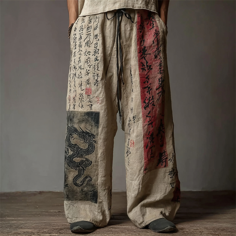 Men's Japanese Dragon Calligraphy Colorblock Linen Pants
