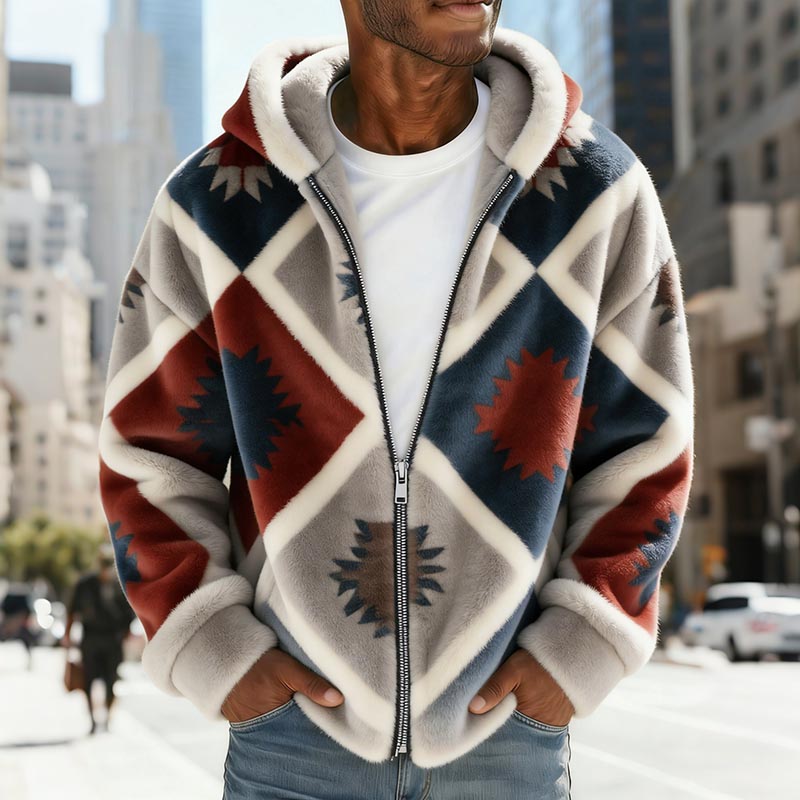 Men's Vintage Geometric Plush Warm Zip-up Hooded Sweatshirt