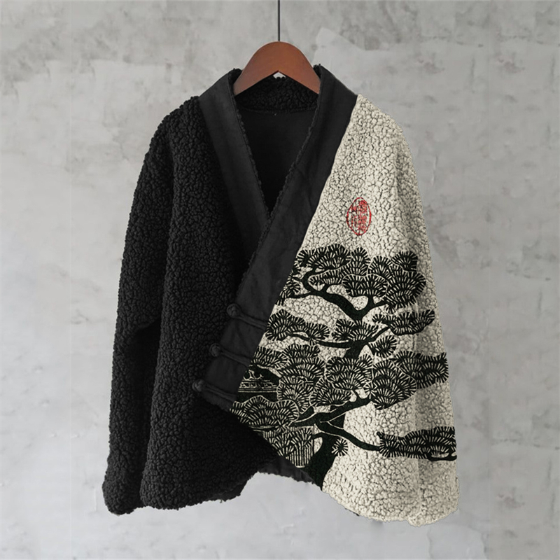 Pine Tree Japanese Lino Art Contrast Cozy Fleece Kimono Cardigan