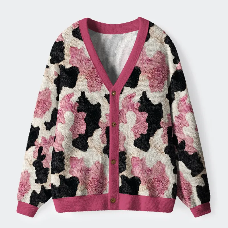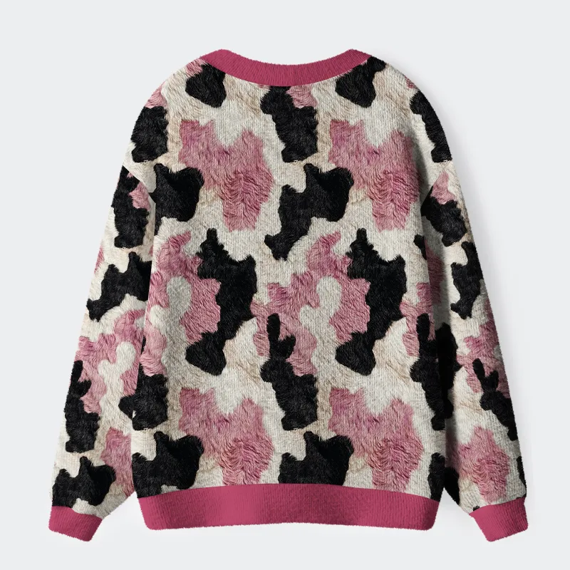 Pink-patch Pastures: Whimsical Cow Print Ugly Cardigan Sweater