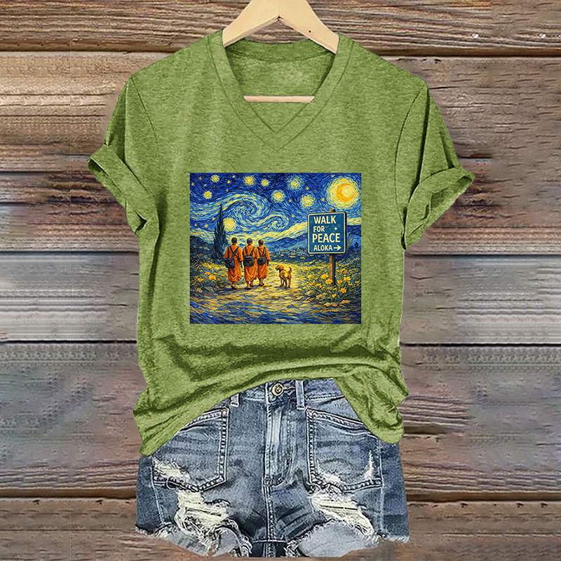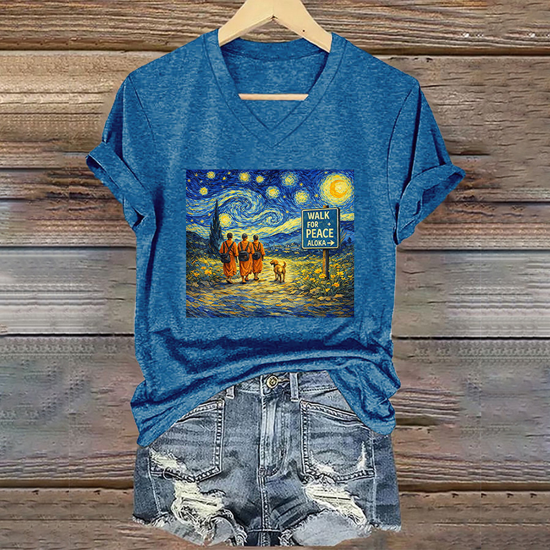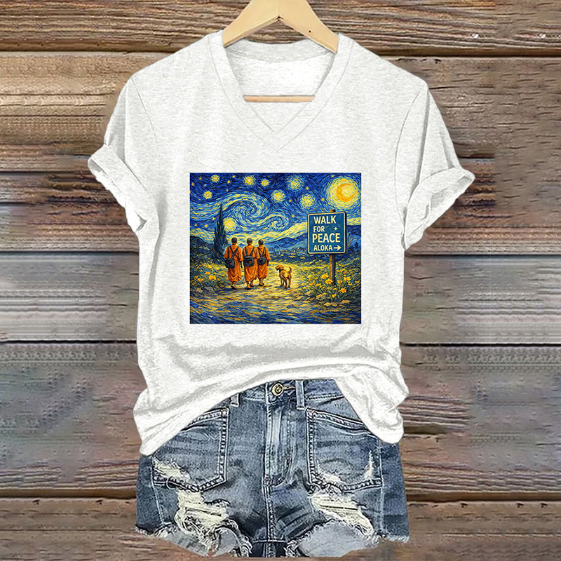 Retro Peace Walking Monk And Aroka Dog Print T-shirt