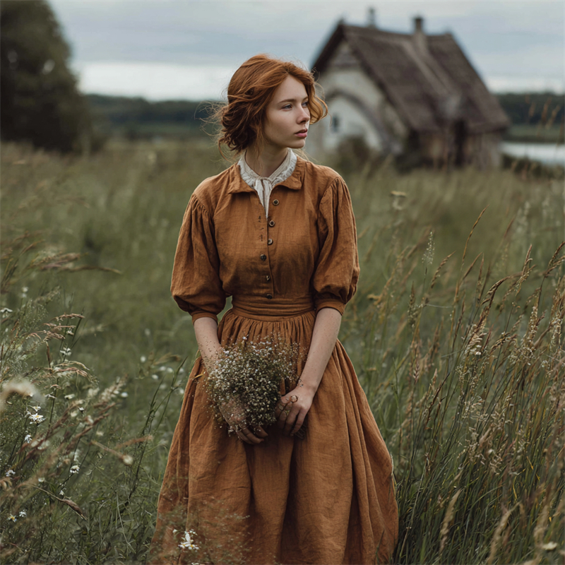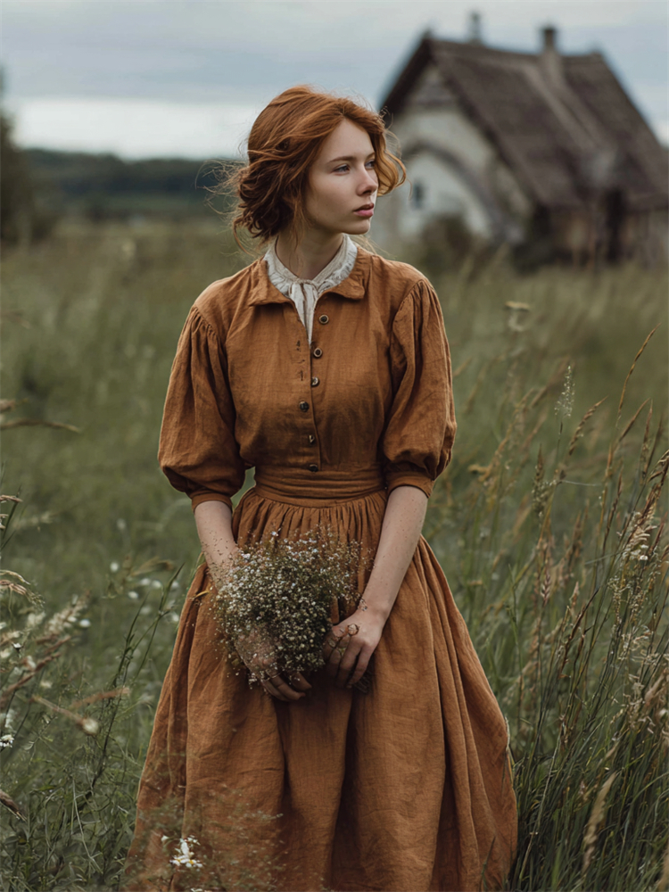 Vintage Shirt Collar Puff Sleeve Linen Maxi Dress