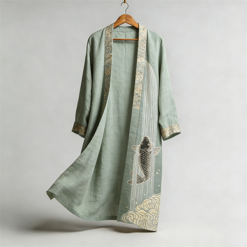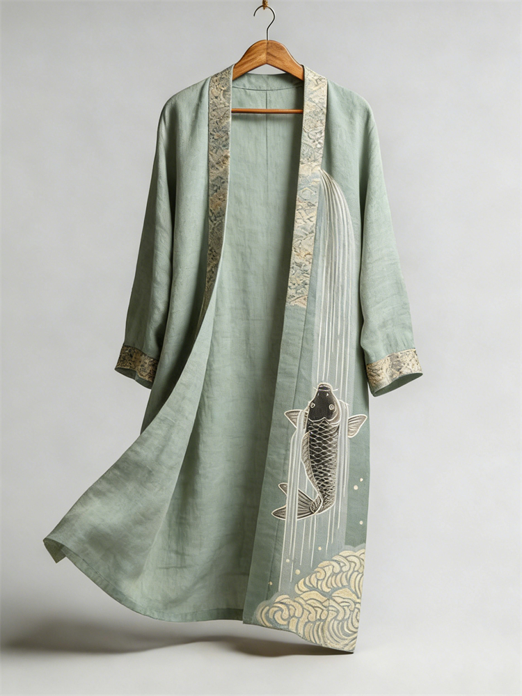 Japanese Koi Carp Fish Upstream Flowy Linen Long Kimono