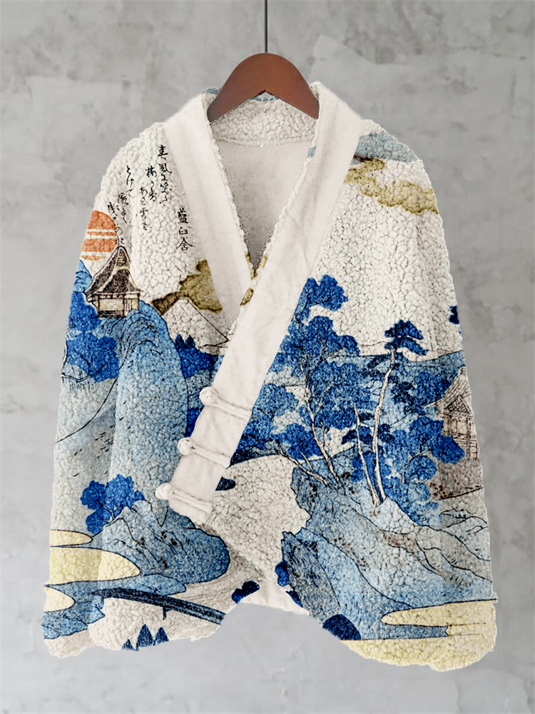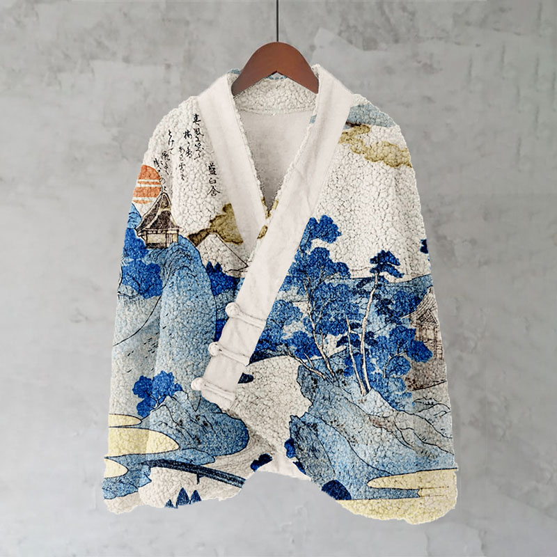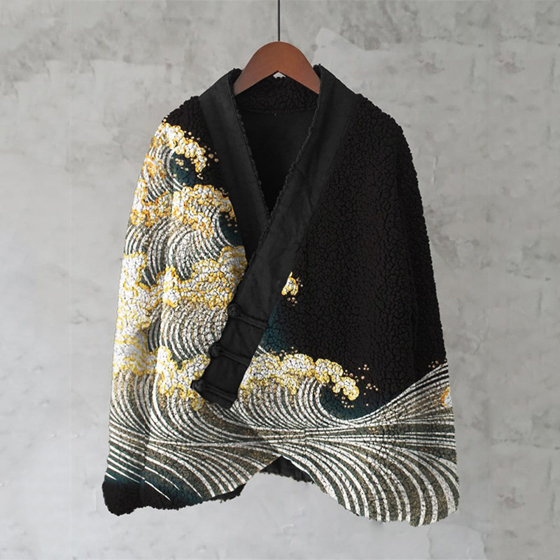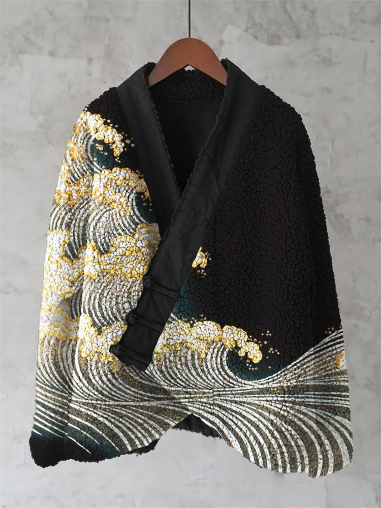 Sea Waves Japanese Contrast Art Cozy Fleece Kimono Cardigan
