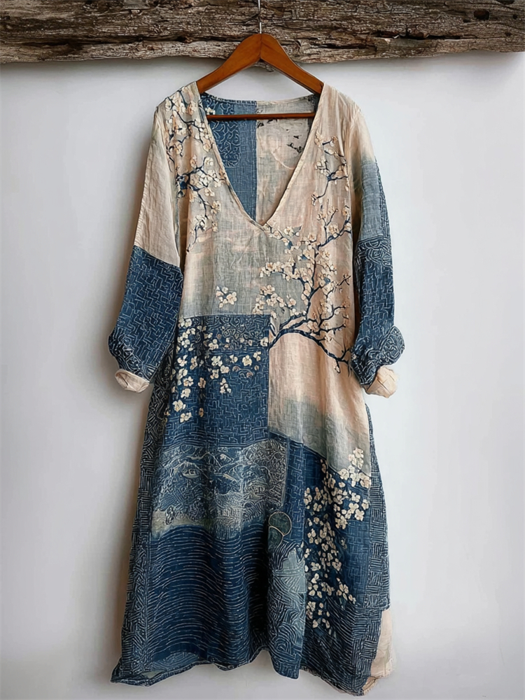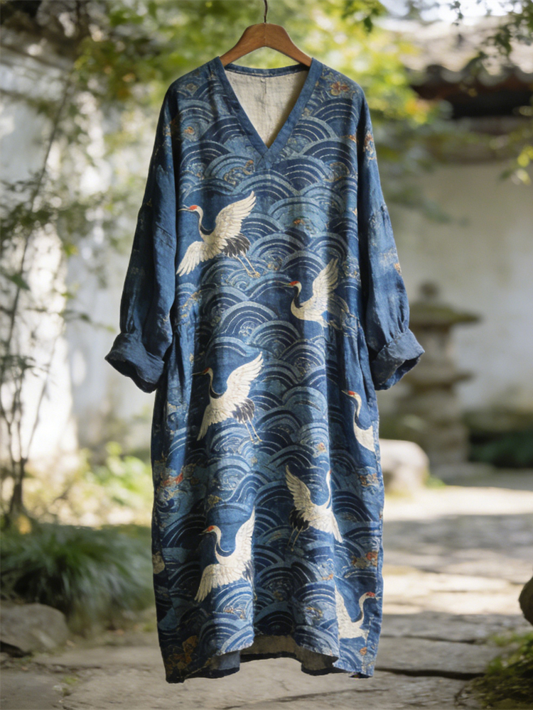 Vintage Japanese Ocean Crane Pattern Women's Linen V-neck Maxi Dress