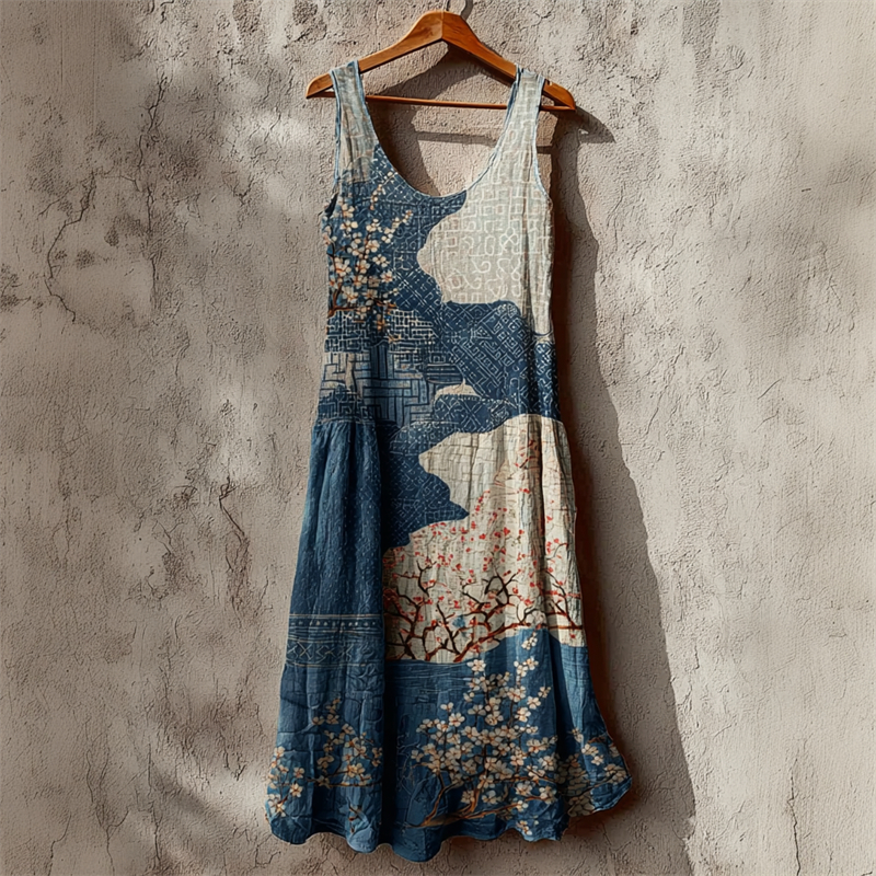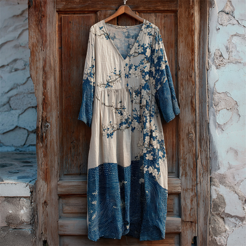 Cherry Blossom Sea Waves Japanese Sashiko Art Linen Maxi Dress