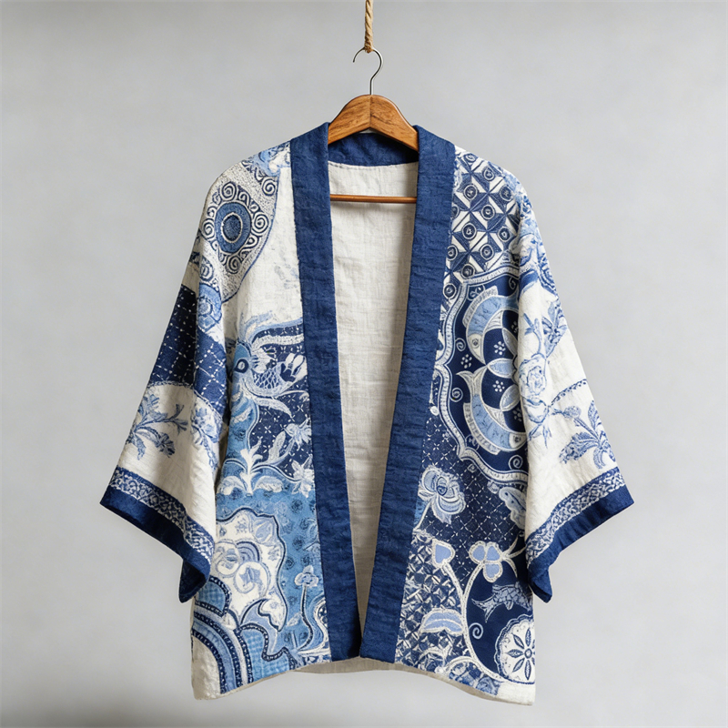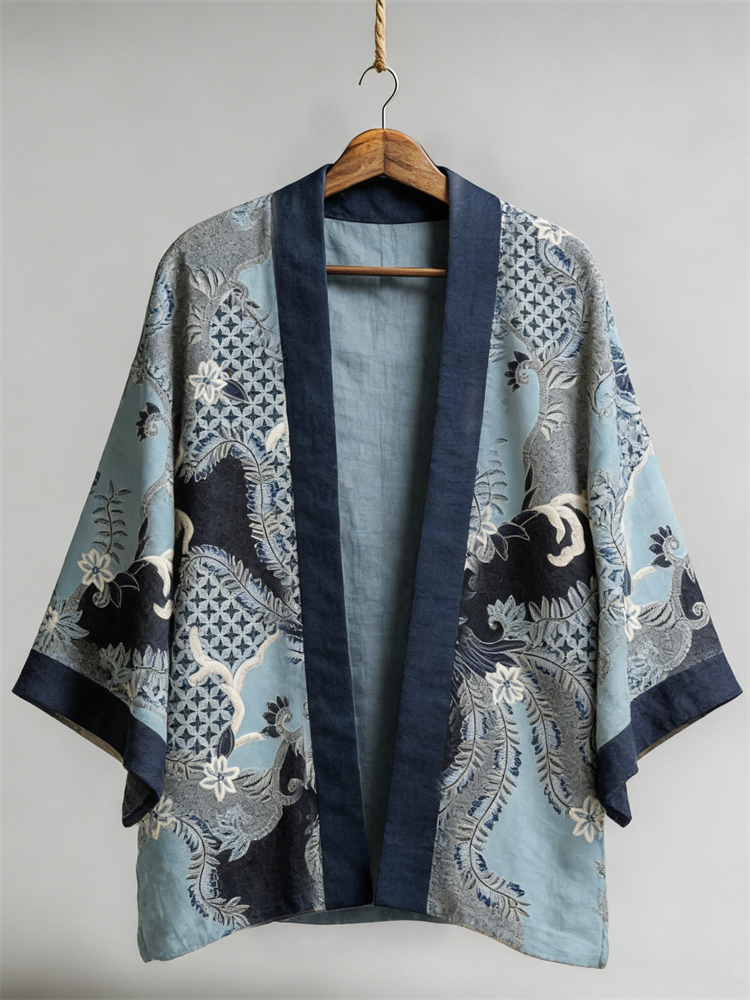 Japanese Floral Sashiko Colorblock Linen Kimono