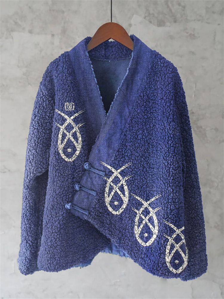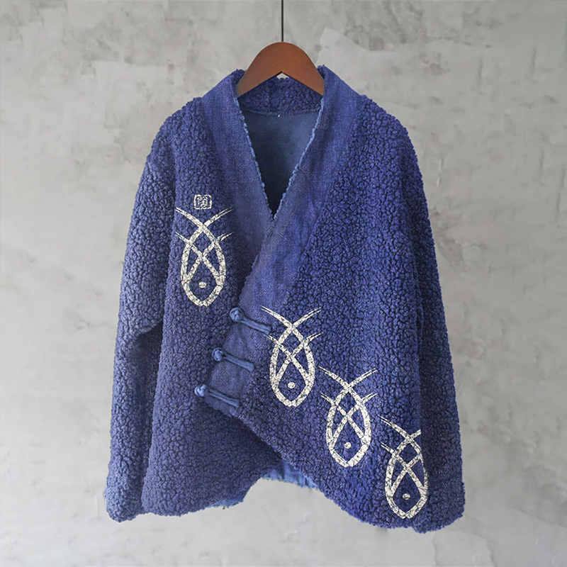 Japanese Fish Lino Art Cozy Fleece Kimono Cardigan