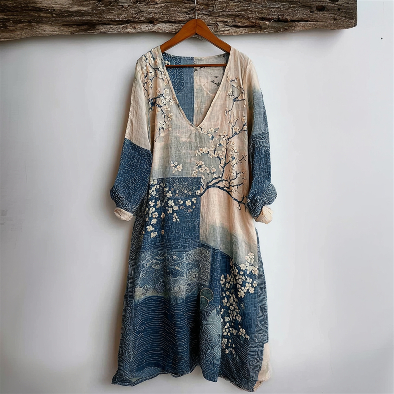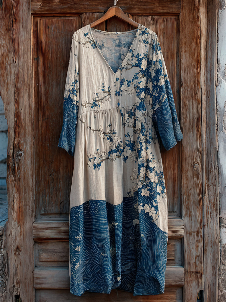 Japanese Almond Blossom Sea Waves Contrast Linen Dress