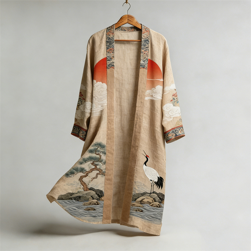 Japanese Crane Sunrise Landscape Flowy Linen Long Kimono