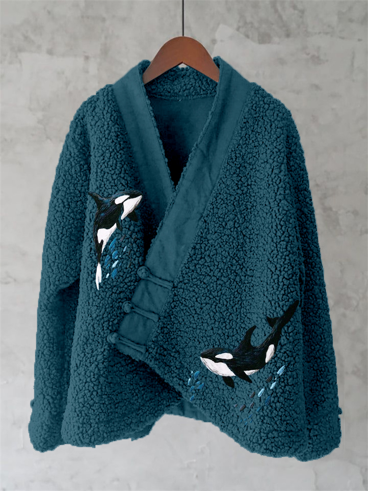 Ocean Whales Embroidery Art Fleece Kimono Cardigan