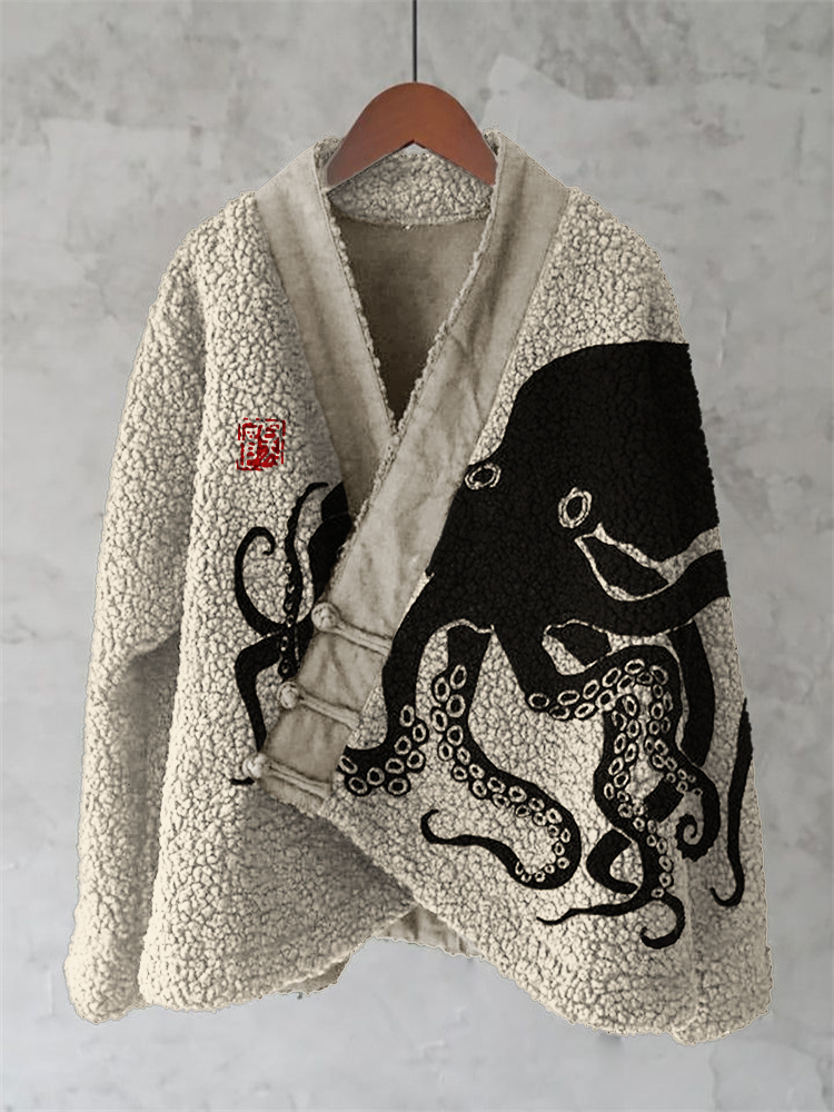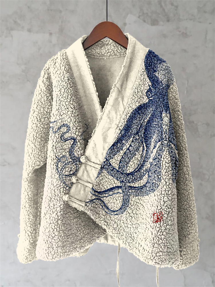 Vintage Octopus Art Painting Pattern Fleece Kimono Cardigan