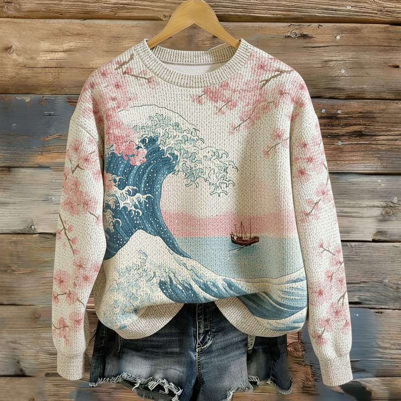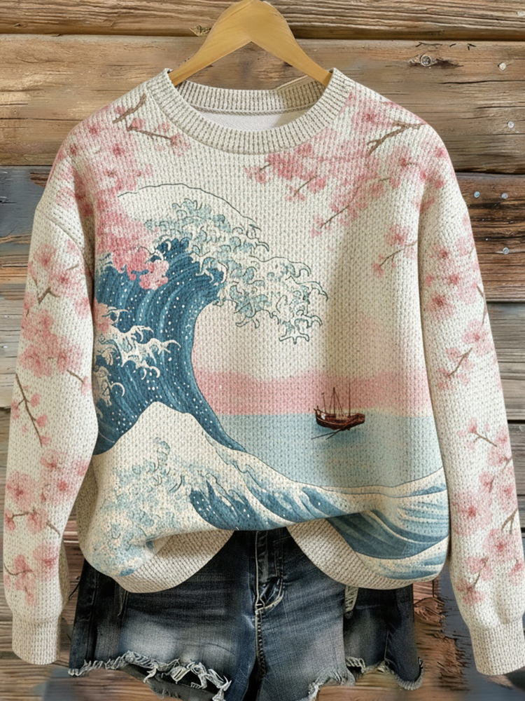 Women's Japanese Floral Ocean Pattern Comfortable Knit Sweater