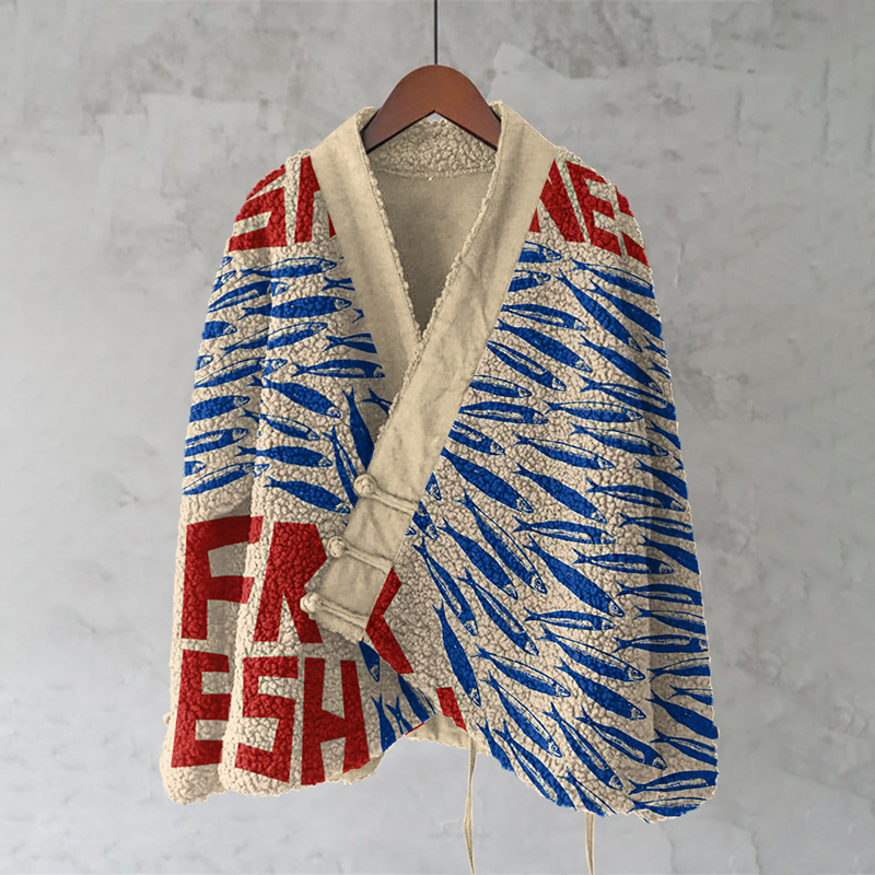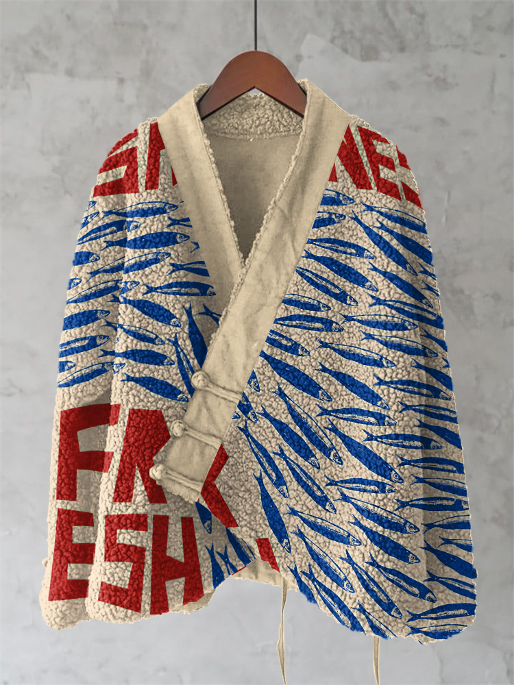 Vintage Fish Sardines Art Painting Pattern Fleece Kimono Cardigan