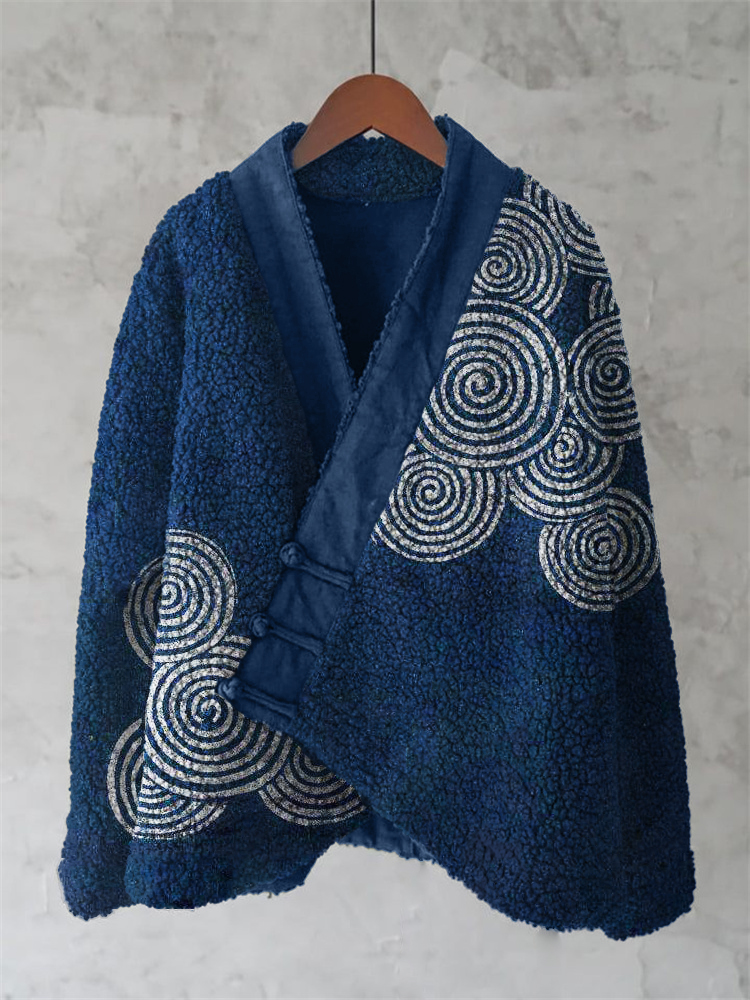 Japanese Sea Waves Ripples Lino Art Cozy Fleece Kimono Cardigan