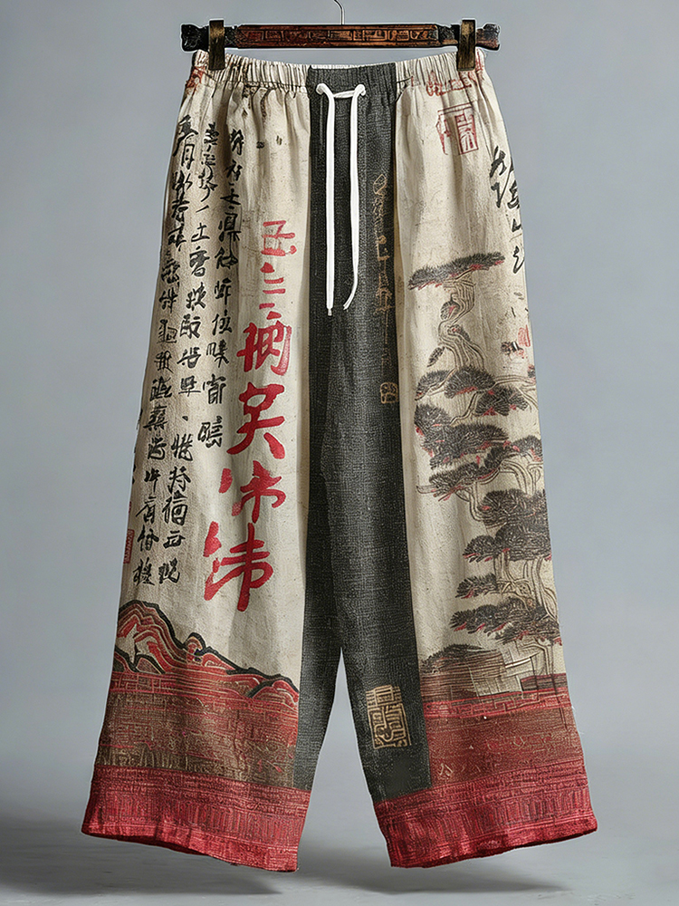 Japanese Pine And Calligraphy Pattern Linen Blend Trousers Pants