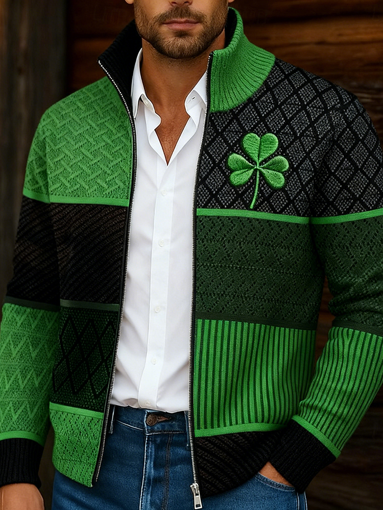 Men's Vintage St Patrick's Day Shamrock With Diamond Pattern Art Cozy Knitted Gentleman Full Zip Cardigan