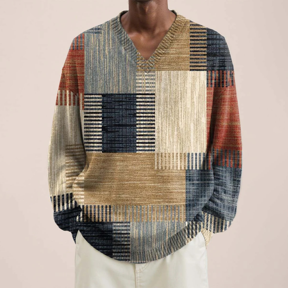 Men Colorblock Ethnic Patchwork Fabric Art Print V-neck Lnit Long Sleeve Sweater
